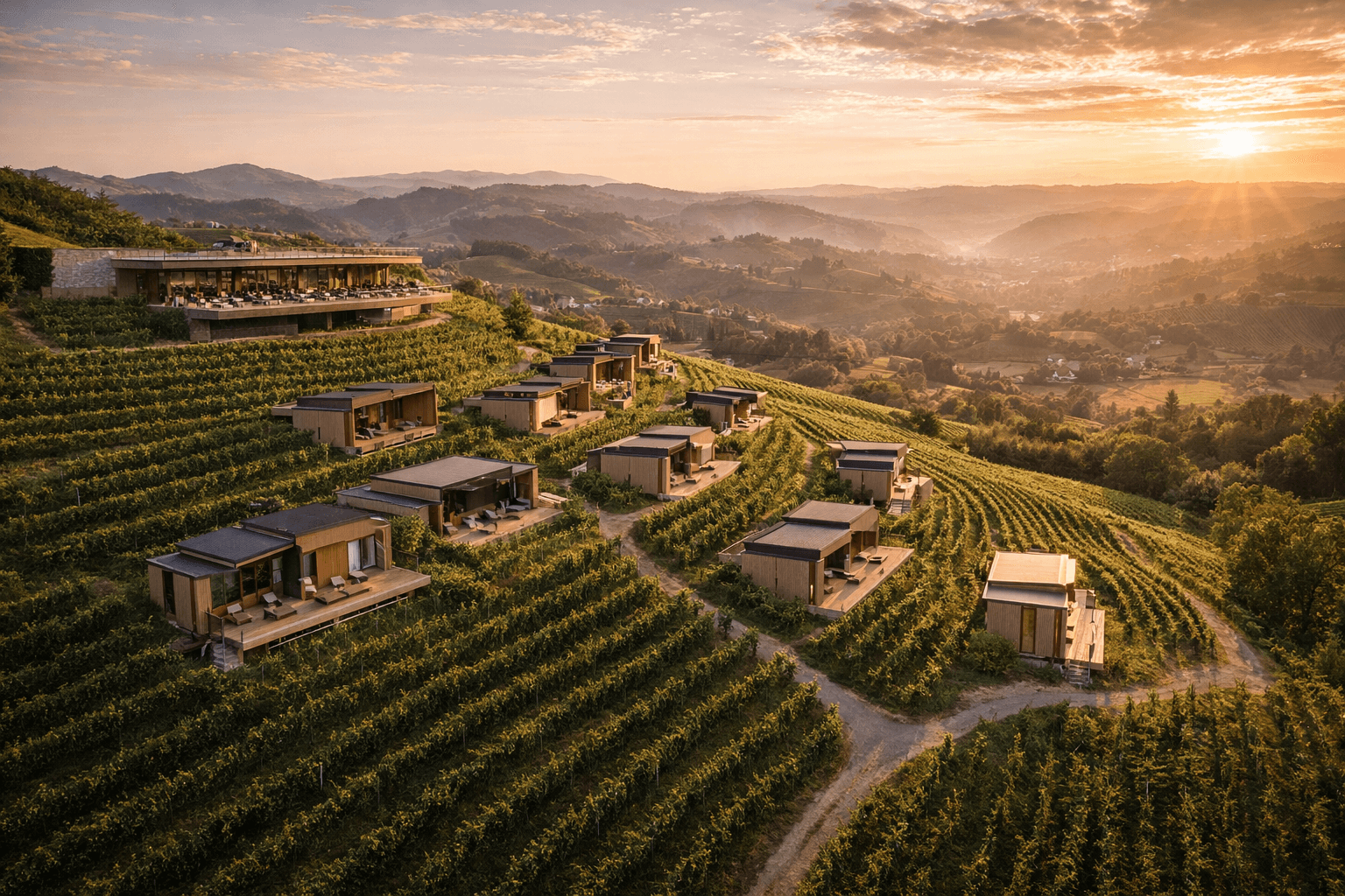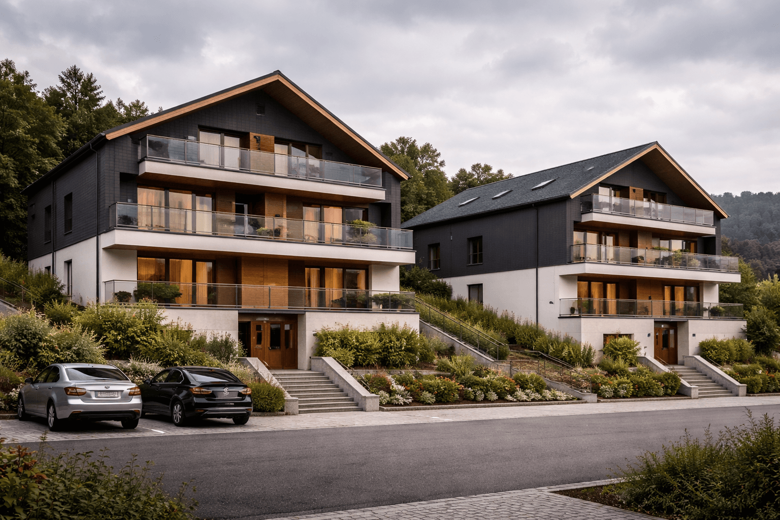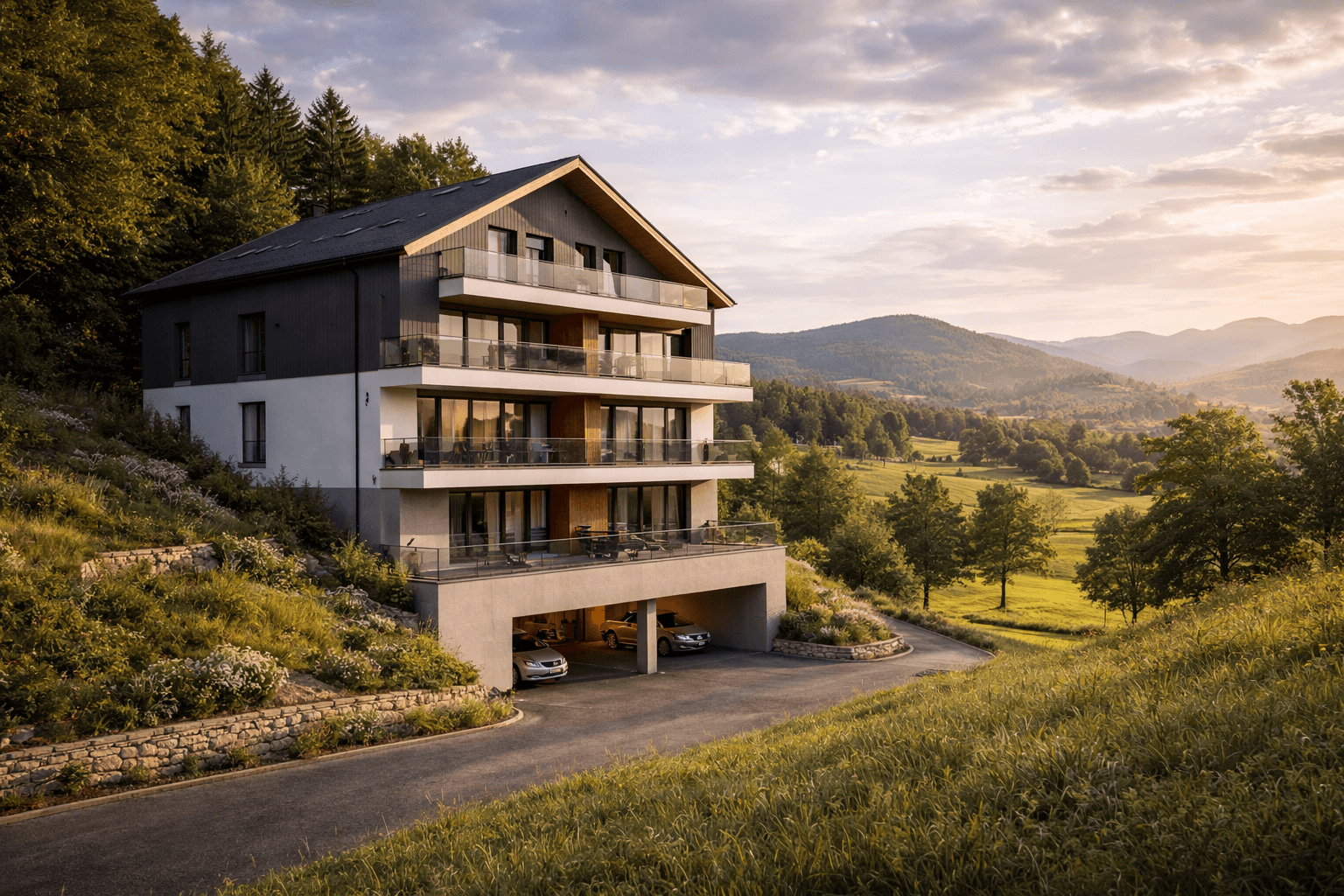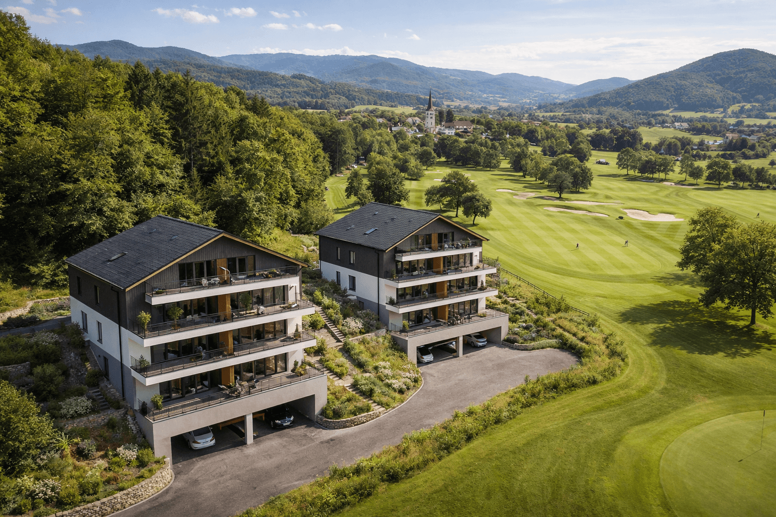 Die Architektur verbindet klassische Satteldach-Silhouetten mit zeitgemäßer Fassadengestaltung — dunkle Putzflächen, helle Akzente und großzügige Balkone nach Süden.